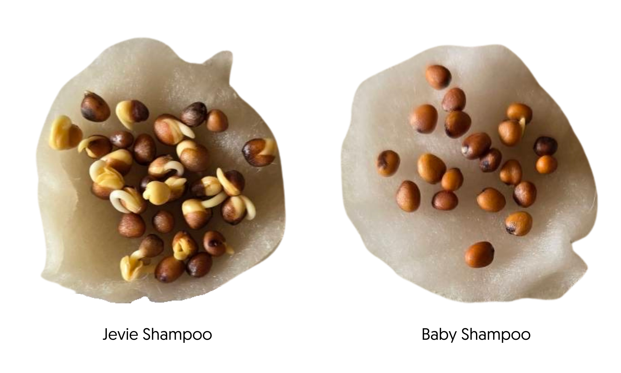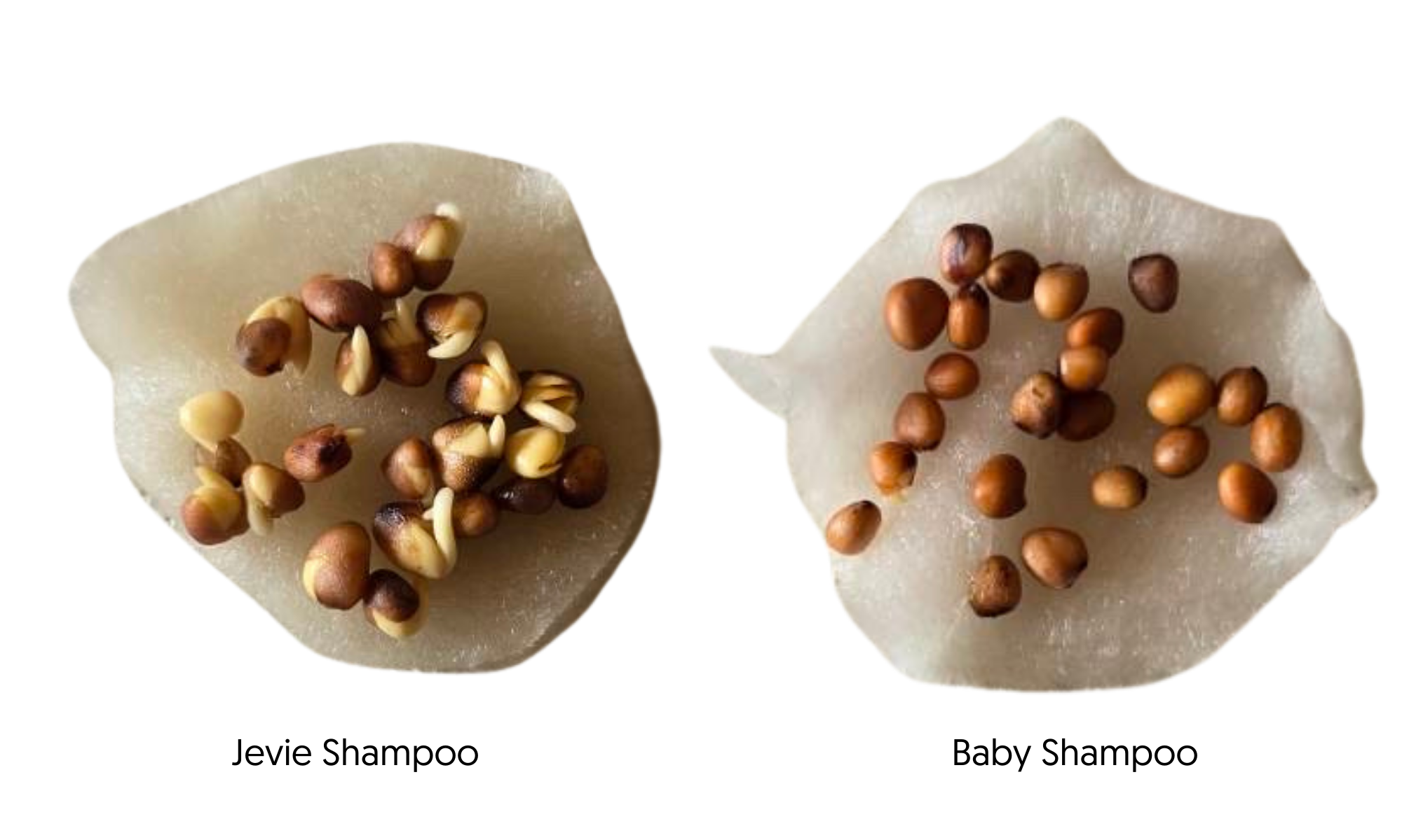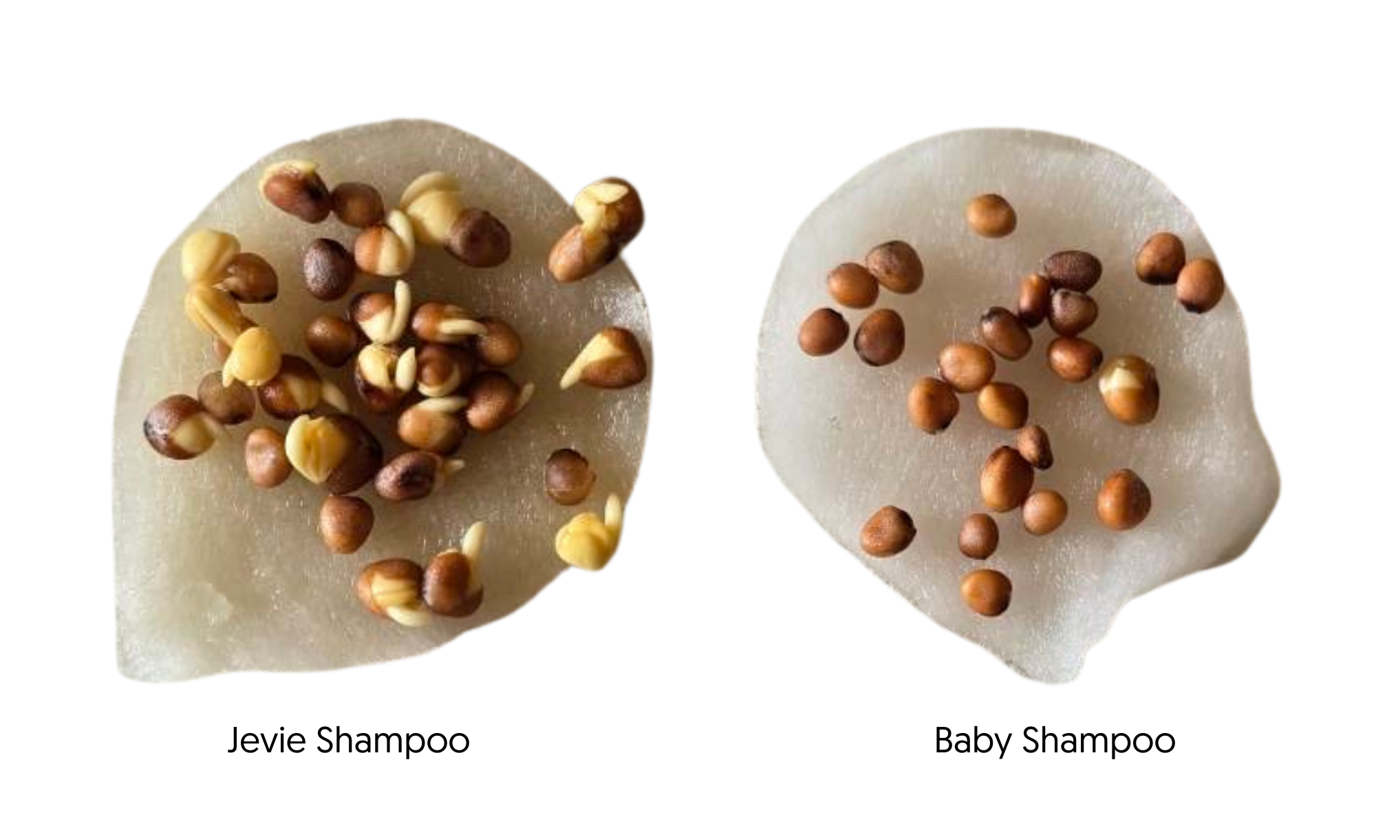 Dr. Mesri によって、ラディッシュ(はつか大根)の種を使ったシンプルな発芽テストを行ってみました。種は成分に敏感に反応するため、植物研究において観察の指標として用いられることがあります。その結果、Jevieの溶液では発芽が見られ、比較対象とした市販のベビー用シャンプーでは発芽が確認されませんでした。この試験は、Jevieの処方が植物の観察においてもやさしい性質を持つことを示す参考データとなりました。